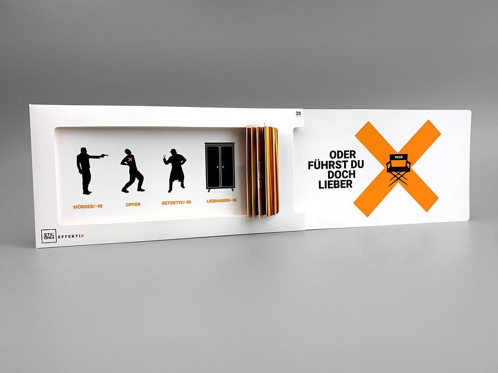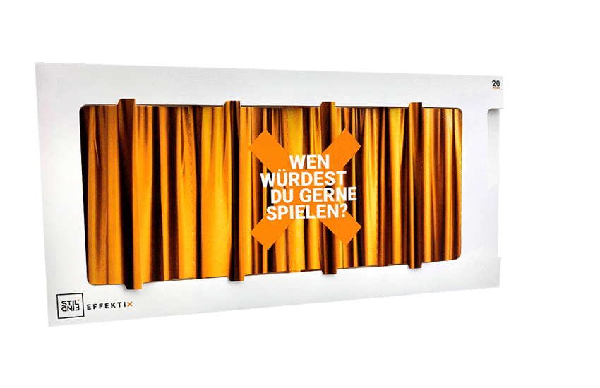 Die Vorhangkarte verwandelt jede Enthüllung in einen dramatischen Moment, zu dem jeder die Luft anhält. Ganz ähnlich einer Premiere im Theater schafft die Jalousiekarte eine Bühne für deine Mailing-Kampagne. Wenn an der Lasche gezogen wird, bewegt sich der Kartonvorhang beiseite und gibt die verborgenen Inhalte dahinter frei. Diese interaktive Bewegung zieht unweigerlich die Aufmerksamkeit auf sich und macht die Vorhangkarte zur idealen Wahl für exklusive Premieren und Produktvorstellungen. Nutze den Überraschungsmoment, um deine Produkte und Dienstleistungen in einem neuen Licht zu präsentieren. Diese interaktive Karte bietet eine spannende Möglichkeit, deine Botschaften zu enthüllen und deine Zielgruppe zu engagieren. So gehen deine Direktmarketing-Maßnahmen ganz sicher glatt über die Bühne.